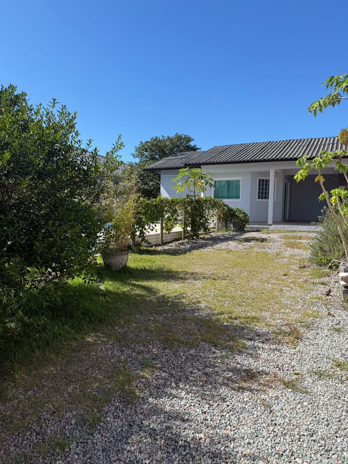 Bela casa na região da Pinheira, Piscina, com 1 dormitório, 2 banheiros, sala e cozinha conjugada, área com churrasqueira, 1 garagem coberta.