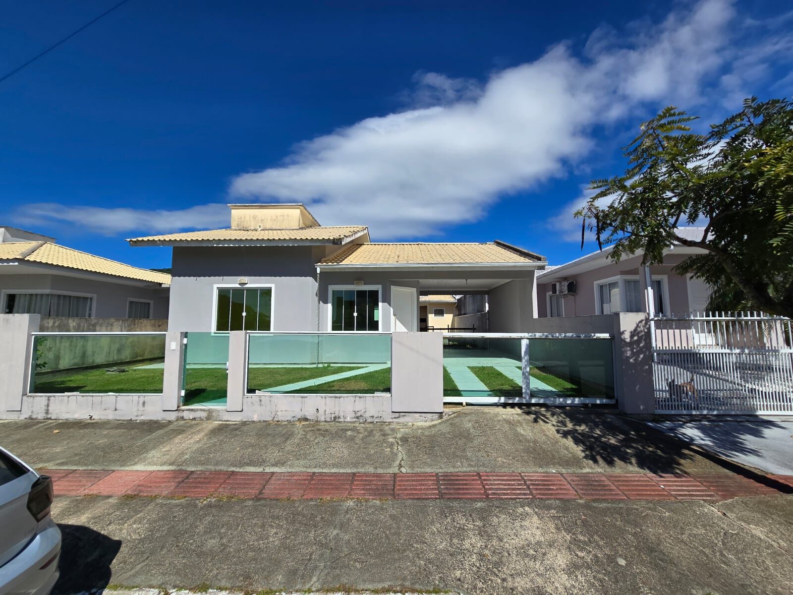 A casa possui sala e cozinha integrada, lavanderia, 3 quartos sendo 1 suíte, 1 banheiro social, área externa com churrasqueira e área de serviço e lavabo.